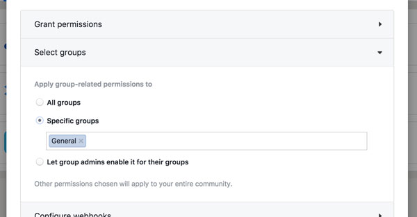 3. Adjust your Facebook Workplace custom integration privacy and access details to suit your organisation. You can restrict access to what Crowd Convergence sees to specific groups under the 'Select Groups' tab. Note: Crowd Convergence can only access content in OPEN or CLOSED groups to which the custom integration is invited. SECRET groups cannot be seen at all.