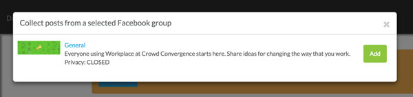 4. Navigate to the Content page of your Widget within Crowd Convergence Social. Select your content source as Facebook Workplace and click 'search'. All available and accessible Workplace Groups will be shown (OPEN or CLOSED groups only, never SECRET groups). Add the selected group/s and content will begin collection within a matter of minutes.